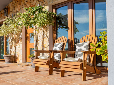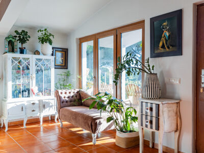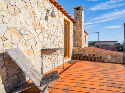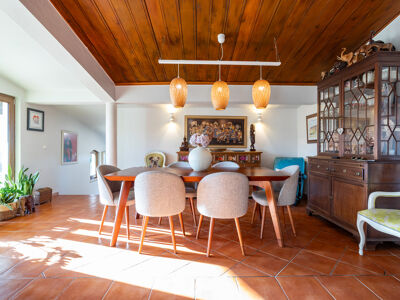A zona social da casa é complementada por um agradável alpendre junto à sala, ideal para desfrutar da vista e do sossego da paisagem envolvente, seja para um pequeno-almoço tranquilo ou um final de tarde relaxante.