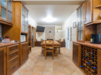 A grandiosa cozinha é dividida por duas zonas, uma para preparação das refeições que inclui também uma despensa e outra de lazer, com uma lareira para os dias frios de inverno.