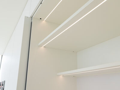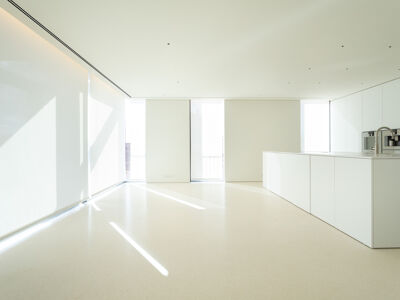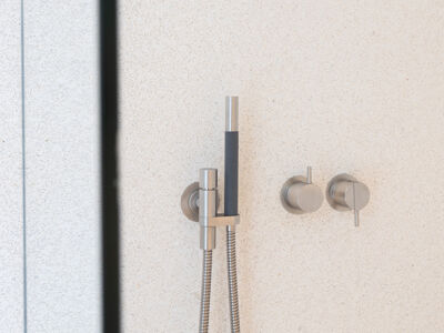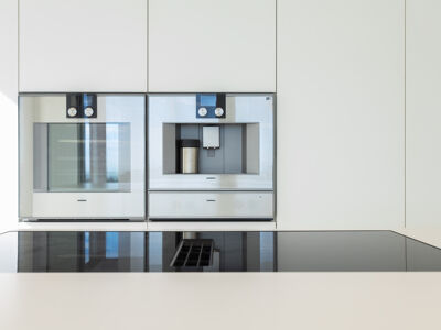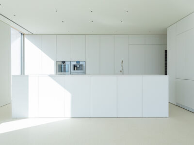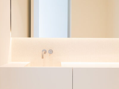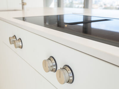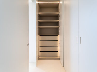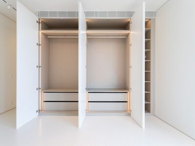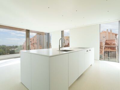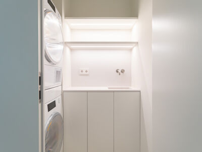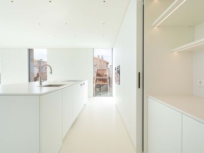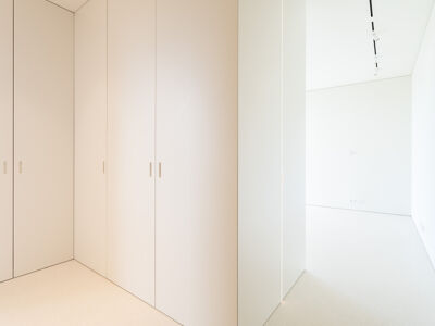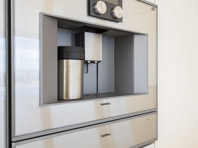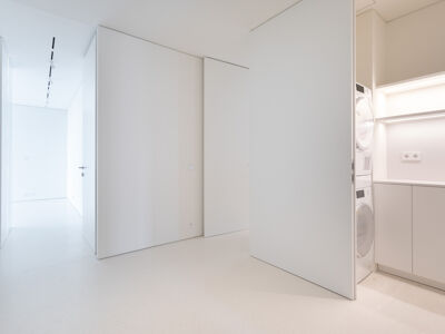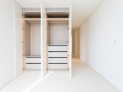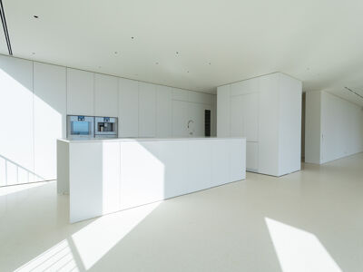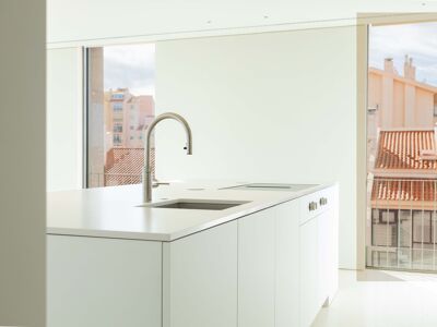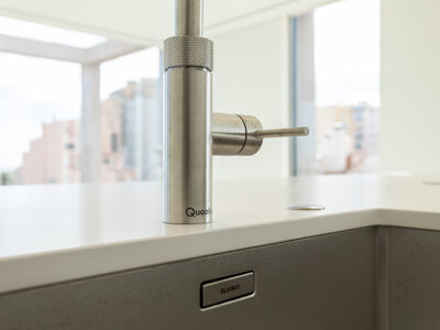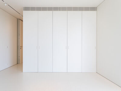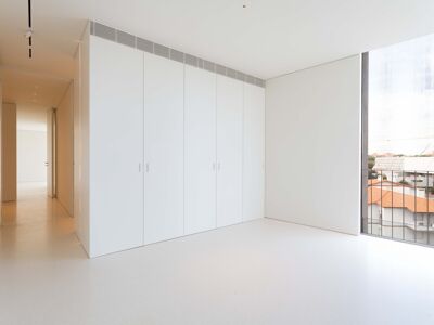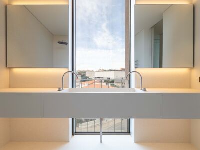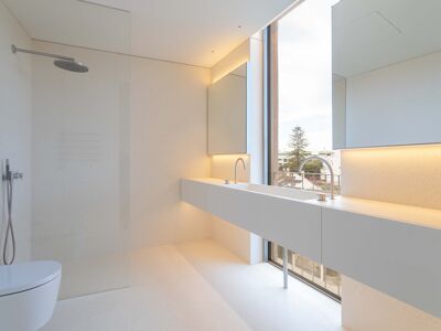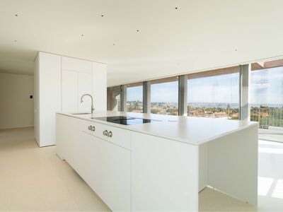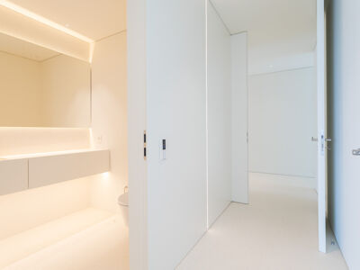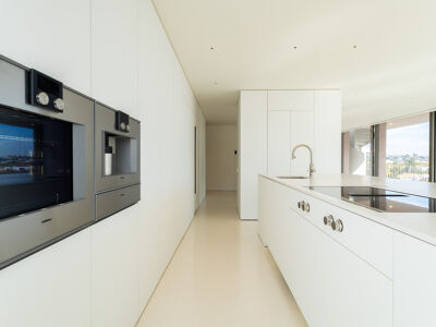 A cozinha apresenta equipamentos e materiais de topo, incluindo torneiras Quooker com água a ferver ou gelada instantânea e filtro, mobiliário SCIC, ilha em Silestone e eletrodomésticos Gaggenau, como placa de indução, frigorífico e máquina de café. Nas casas de banho, destacam-se as torneiras VOLA, chuveiros efeito chuva, toalheiros elétricos e autoclismos GEBERIT. O apartamento dispõe ainda de pavimento radiante Uponor, estores elétricos reguláveis, iluminação LED, roupeiros com luz interior, interruptores JUNG e sistema de domótica KNX com controlo por smartphone. A master suite possui porta blindada e o imóvel conta com sistema de alarme e botão de pânico.