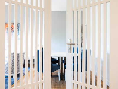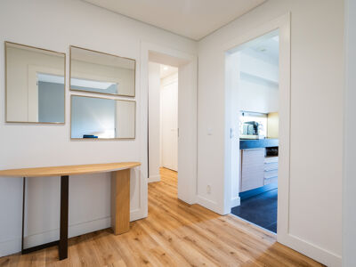 -Área social luminosa composta por hall de entrada, uma sala ampla que se estende para uma varanda soalheira com vista para os jardins.